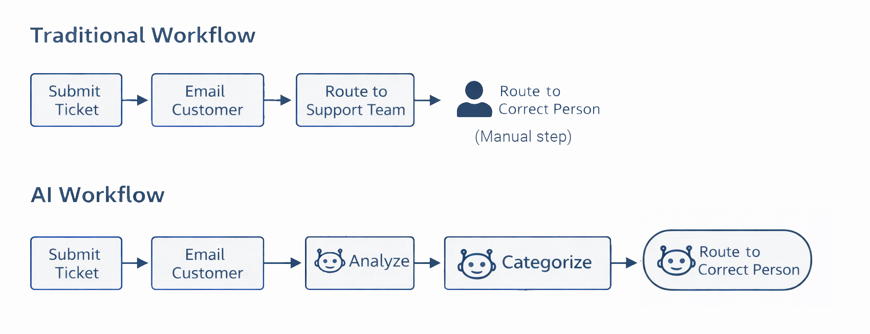 For instance, a traditional workflow process might receive a support ticket, email a confirmation to the customer, and route it to the support team. Then, someone on the support team classifies it and routes it to the appropriate person.