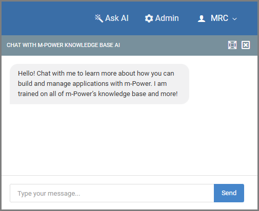 Once AI has been enabled and an API Key has been registered, the chat bot can be accessed from anywhere inside the m-Power development interface. The Ask AI button is located in the top-right corner of every screen. Clicking this button opens the chat window titled “Chat with m-Power Knowledge Base AI.”