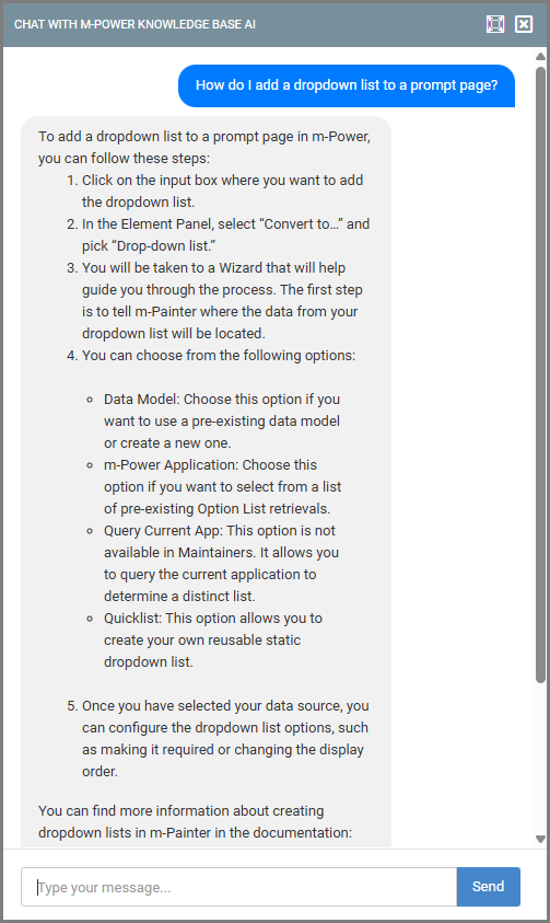 The AI m-Power Chat Bot allows developers to ask general “how-to” questions and receive immediate guidance directly within the m-Power interface. It is built using the m-Power documentation and training manuals as its knowledge base, making it an ideal tool for understanding features, learning best practices, and receiving development tips.