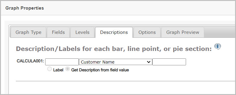 The descriptions tab allows you to change the labels of various parts of your graph. This screen will look very different depending on your graph type, the number of field selections you have, and the level of detail from which you are pulling.