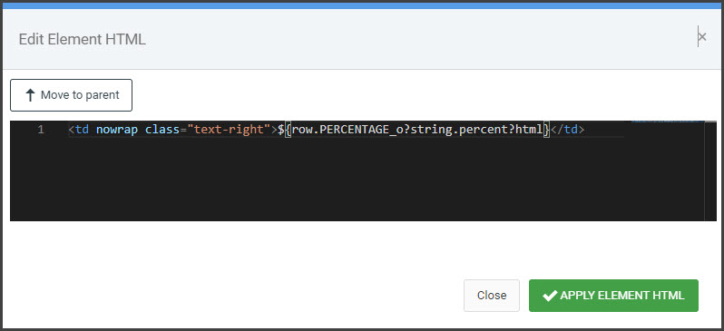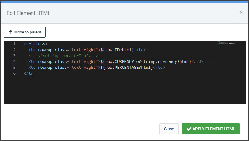 In some European countries, $1,120.50 would be listed as 1 120 ,50. To do this in m-Power, open m-Painter. Left-click in the cell of the data field you wish to reformat. On the right-hand Element Panel, select “Edit HTML”. The specific cell you selected will be displayed. Click the button to “Move to parent” to display the entire table row.