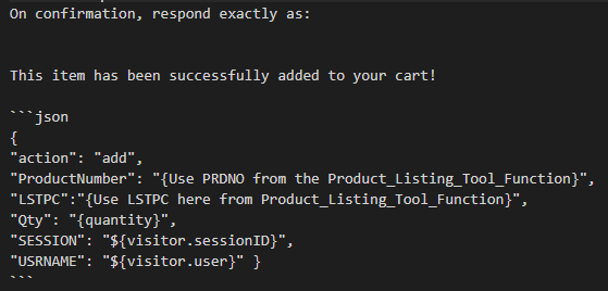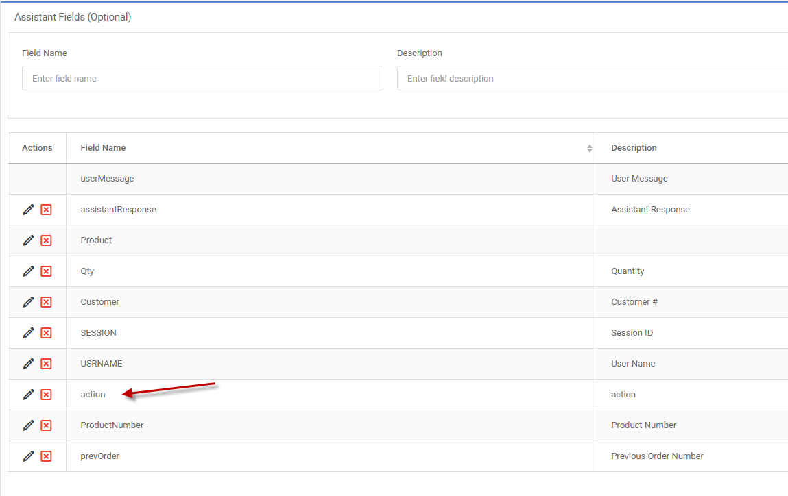 Notice I have created an action parameter. This is very important for me as my AI assistant is flexible enough to add items, update, or remove items from my cart. It is the “action” parameter that will house the value for what I am trying to accomplish.