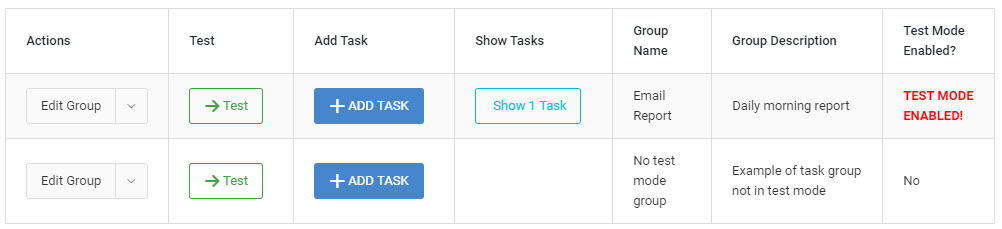 There is also the option to put Task Groups into Test Mode. When creating or editing a task group check the Enable Test Mode box to have all the emails generated by that task group sent to a specified e-mail address. When the task group is ready for production, simply uncheck the box. Task Groups that have Test Mode enabled will appear bold and in red on the Messaging and Scheduled Tasks page.