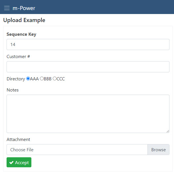 File Upload Directory — The location on the m-Power server where this file will be uploaded. If the folder does not exist, it will be created.