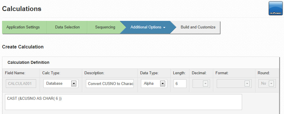 Data Type — This option allows you to control whether your field will be: Alpha, Numeric, Date, Time, or Timestamp. When selecting a data type, the Length & Decimal attributes will automatically be filtered for you to only show you valid options. For instance, when choosing a numeric calculation, the "blank" option of Decimal length will be removed as numeric calculations must have a decimal length. Or, when choosing alpha calculation, the decimal dropdown will become disabled as alpha calculations do not have a decimal.