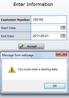In the example provided, we check to see if field STARTDATE, from Maintenance #230 is greater than the ENDDATE field. If it is, we force the browser to return the message "Start Date is greater than End Date" and we disallow the form from submitting, allowing the user to correct their mistake. If STARTDATE is less than or equal to ENDDATE, no message will be seen and the browser will submit the form to the database.